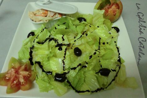 Netegeu l’enciam i els tomàquets, talleu l’enciam a trossos i els tomàquets a octaus. Distribuïu-ho sobre el plat, amaniu-ho, poseu el vinagre de Mòdena sobre l’enciam i distribuïu les olives al damunt de tot