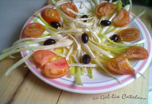 Talleu el tomàquet en lamines finetes i la ceba tendra al llarg