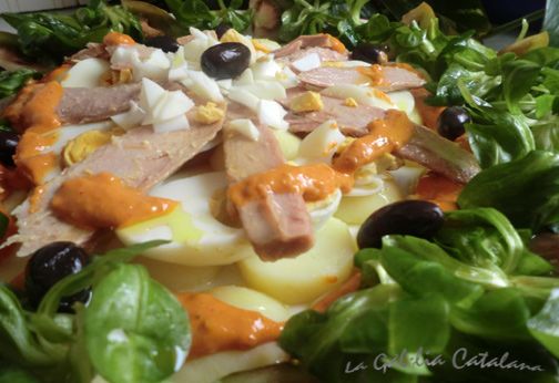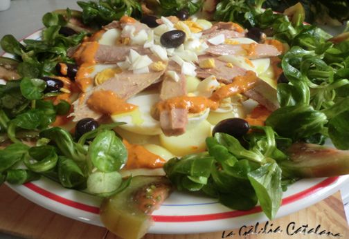 Poseu un llit de patata al centre del plat, envolteu-lo de tomàquet, per la part exterior, repartiu al centre del plat primer l’ou i al damunt la ventresca, afegiu-hi la salsa de romesco saleu al gust i poseu els canonges per damunt, damunt d’ells repartiu les olives i amaniu amb oli.