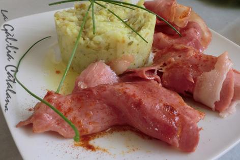 Col·loquem en un plat el puré de patates, en aquest cas en un motllo. I tot seguit passem per la planxa ben calenta els talls de lacón. Disposem el lacón en un costat de les patates. Per sobre posem una mica d’oli d’oliva barrejat amb una culleradeta de pebre vermell dolç. Si volem podem afegir una mica de sal maldon per sobre que a més de sabor garantirà una textura diferent.