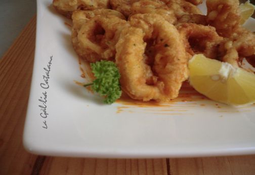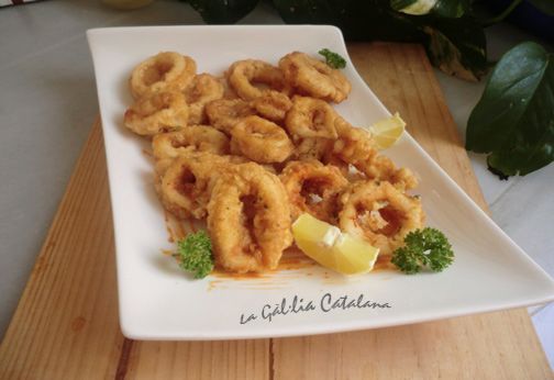 Netegeu bé els calamars, i talleu-los es rodanxes, saleu-los i passeu-los per farina espolsant-ne l’excés.