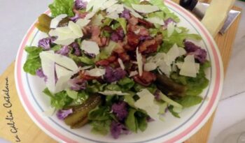 Ingredients: Enciam Flors de Bròquil lila Cogombrets en vinagre Formatge Parmesà laminat Bacó Oli i sal Preparació: Netegeu l’enciam i talleu les fulles en trossets, talleu el bròquil en flors i els cogombrets en lamines. Poseu una paella amb un