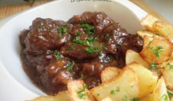 Ingredients per a 3-4 persones 650 grams d’espatlla de vedella tallada en daus 1 cullerades de mantega 2 cullerades d’oli d’oliva 2 cebes mitjanes, picades 2 grans d’all picats 1 ½ cullerada de pebre vermell dolç 1 fulla de llorer