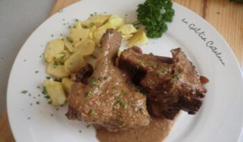Ingredients per a 4 persones: 1.2 kg de costellam de vedella (barnilles de costella) 1 ceba gran Un grapat de nous pelades 1 got de vi blanc 1 litre de brou de carn Dos nous de mantega Pebre negre Oli