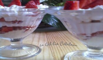 Ingredients 2 persones: 6 o 8 maduixes 2 boles de gelat de vainilla 200 ml de nata liquida Sucre a gust del consumidor Estris: Dues copes grans, si poden ser de gelat millor Batedora Elaboració: Talleu les maduixes en làmines.