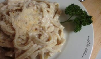 Ingredients per a 2 persones: La pasta fresca veure recepta Pasta Fresca 200 cc de crema de llet per a cuinar (18% MG) 1 ceba 1 llauna gran tonyina Formatge ratllat, al gust, jo poso Parmesano Sal, oli i pebre