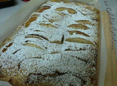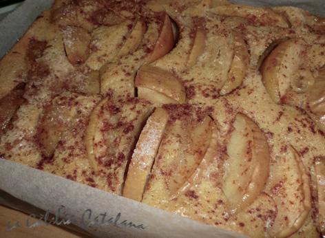 Apart, haurem netejat les massanes, de les que haurem tret el cor, amb l’ajut d’un buidador, i sense pelar les partirem en trossos, que col·locarem per damunt, fins omplir tota la superfície de la pasta.