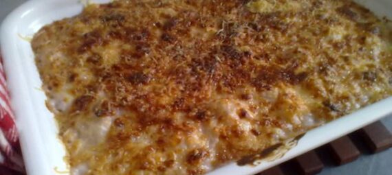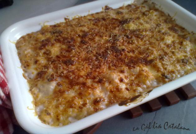 A la mateixa paella i amb la mantega daurem la ceba tallada en brunoise fins al punt que estigui transparent; hi afegiu la farina i aneu remenant, deixeu-la coure sense que es dauri i tot seguit aboqueu-hi la llet un xic calenta. Continueu remenant amb un batedor petit fins que bulli i llavors poseu-hi sal, pebre i nou moscada. Deixeu-la al foc un parell de minuts més, remenant de tant en tant, i traieu-la.