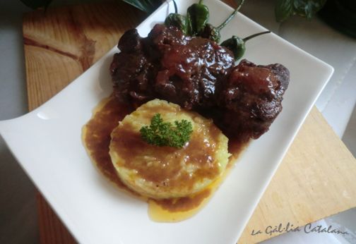 Un cop enrossida la reserveu, en el mateix oli enrossim o pochem les verdures de la maceració deixem reduït i afegim el tomàquet ratllat, el deixeu reduir també i quan estigui hi torneu a incorporar la carn i el vi de la maceració juntament amb el caldo de verdures fins cobrir les peces de carn, tapeu l’olla i deixeu coure fins que l’olla piti i desprès vint-i-cinc minuts més, passat aquest temps parem el foc deixem que l’olla perdi tot el vapor comprovem la cocció, que hauria d’estar perfecte, reservem la carn, passem el suc restant i les verdures per el xines i tornem a incorporar-ho a la carn aquesta en una cassola per tal de fer-li l’últim xup-xup, moment que aprofitarem per comprovar el punt de sal i el de cocció per si fos necessari coure-ho una mica més.