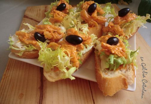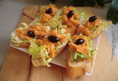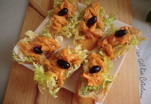 Torreu les llesques de pa, deixeu-les refredar i unteu-les amb la salsa romesco. Poseu-hi damunt l’escarola tallada petitona i el bacallà barrejat amb més salsa romesco, adorneu cada llesqueta amb una oliva negra