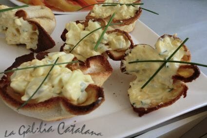 Bullir els ous durant 12 minuts. Refrescar sota aigua freda (per pelar-los amb més facilitat) i deixar refredar. Pelar-los i tallar-los petits.
