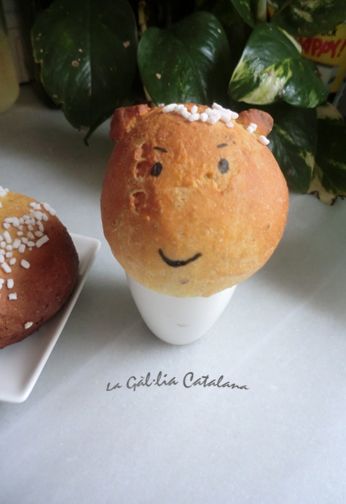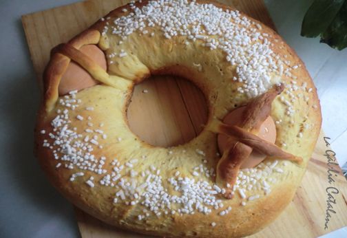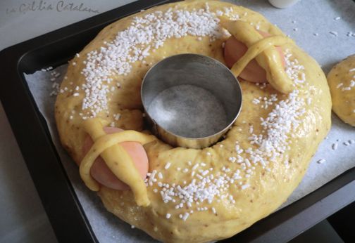 Col·loqueu aquest tortell a una plata i unteu-la amb oli per tal que no faci crosta. Repartiu-hi per sobre, clavant-los, 2 ous durs amb clova. Deixeu fermentar de nou fins que el volum quasi be es dobli, llavors pinteu amb ou batut, empolseu-ho amb sucre de bolado i poseu-ho al forn preescalfat a 200º i en el moment de posar al forn baixeu-lo a uns 170º. La seva cocció, aproximadament, durarà uns 35/40 minuts, segons el forn.
