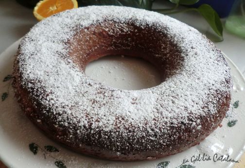 Escalfeu la mantega al micro, per aconseguir textura de pomada, barregeu en un bol els ous i el sucre, batent-ho fins aconseguir que agafi un to blanc, acte seguit hi afegiu tots els líquids,  la mantega inclosa mentre seguiu remenant, afegiu-hi els sòlids i continueu remenant fins aconseguir una massa homogènia que abocareu al motlle i posareu al forn a 170º durant 30/35 minuts depenent del forn que tingueu, comproveu la cocció amb un escuradents. Un cop cuit deixeu-lo refredar i desemmotlleu-lo, decorant-lo amb una mica de sucre glaç o un bany de xocolata, a gust del consumidor, a casa amb el sucre n’hem tingut prou