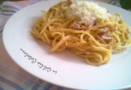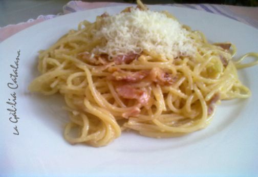 Poseu a bullir els spaghetti en una olla amb força aigua salada, quan estiguin al “dente”, els retireu del foc, els coleu els hi poseu un raig d’oli i els afegiu a la cassola, els remeneu per barrejar-los be amb el contingut de la cassola i agafin color, acte seguit i afegiu l’ou i remeneu enèrgicament per escampar be l’ou, abans no qualli amb l’escalfor, quan tot estigui calent ho serviu acompanyat de formatge rallat