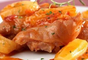 Ingredients per a 4 persones Peus de porc 4 u. Orella de porc 2 u. Ceba gran 1 u. Tomàquets madurs 6. Alls 4 Oli Julivert uns ramets Porro Herbes: pebre, clavells Sal Elaboració: En una olla poseu-hi a bullir