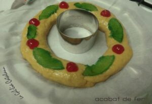 Poseu el tortell sobre la safata de forn, ruixar-lo amb anís, podeu fer servir un esprai  i col·loqueu-hi la fruita confitada per sobre. Tapeu amb un drap net i deixeu reposar per segona vegada perquè dobli el seu volum. Tornar a esquitxar el tortell amb una mica d’aigua i mica d’anís per tal que no s’assequi, poseu-hi sucre bolado (o humit amb aigua) i coeu-lo  al forn a 170 graus durant 20/30 minuts aproximadament, segons el forn.